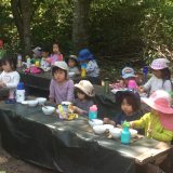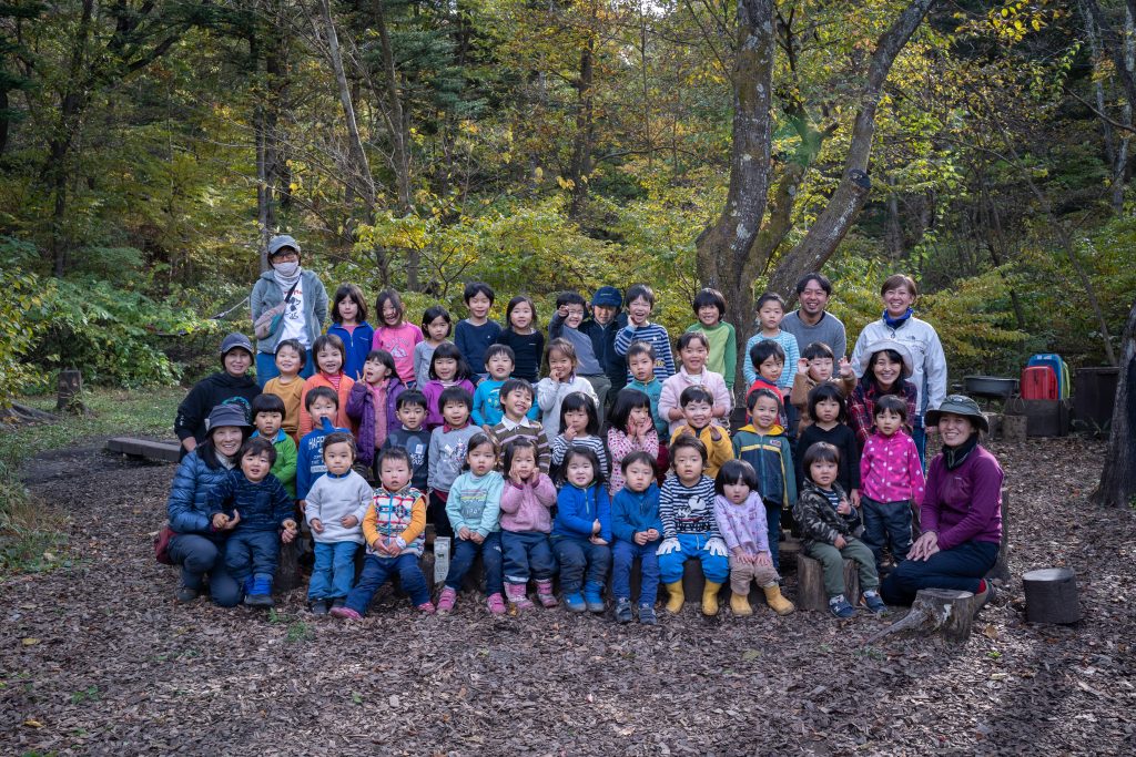 活動時間のほとんどを野外で過ごしていますが、自然遊び、自由遊びを体験することが目的なのではなく、心のつながりを築く場として自然という環境が適していると考えています。2~5歳児が森と仲間と共に様々な体験を通して出会い、関わり合い、育み合う中で仲間への信頼感、自分自身への信頼感を育てています。子どもの力を信じ、育ち合う子どもたちを支える大人の役割も大切だと考えています。